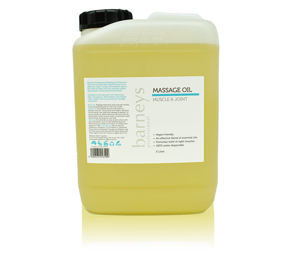 Barneys Professional Massage Oil Muscle & Joint is enriched with essential oils for an effective result. Unique formulation aids in the relief of tight and sore muscles whilst leaving skin moisturised and smooth.